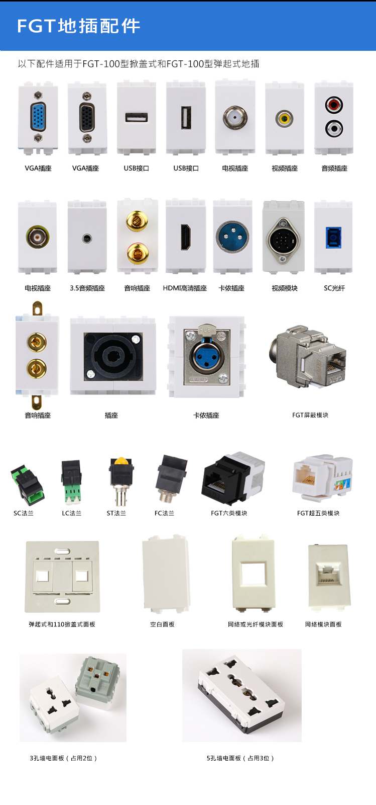 FGT地面插座符合國際標(biāo)準(zhǔn)ISO/IEC11801、TIA/EIA568設(shè)計(jì)制造的大廳結(jié)構(gòu)地板用插座,美觀大方,插座底盒采用特殊工藝有效抵御生繡。地板插座結(jié)構(gòu)獨(dú)特,防水防塵,有彈起式和開啟式兩種。開啟式有五位地板插座??裳b配所有FGT系列面板與模塊,不同顏色的模塊可進(jìn)行多網(wǎng)劃分。