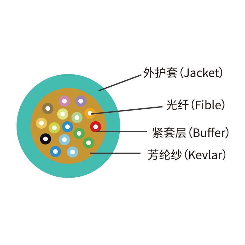 結(jié)構(gòu):緊套光纖由光纖涂覆層表面緊套一層或多層被覆層構(gòu)成,便于剝離使用,光纜套管內(nèi)置多股芳綸加強構(gòu)件、具有良好的機械保護性能和抗拉力
