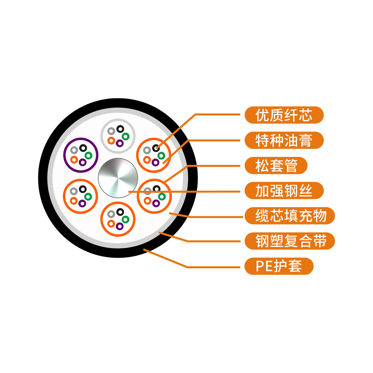 管內(nèi)充以特種油膏,對光纖進行了關(guān)鍵性保護,松套管內(nèi)填充特種防水化合物